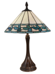 Our Melo Jewel Tiffany Table Lamp adds an elegant, understated touch of the great outdoors to any room of your home or office. Conical shades begin with a background of wedge shaped art glass pieces in crisp white. Each panel is separated by bold filigree for contrast and definition. The shade’s edge is a horizontal leafy vine in tranquil blue-green. The leaves are dotted with clear glass gems and are artistically nestled together between dual borders in matching colors. This pleasant table lamp features generously sized flared shade sitting atop a lovely base finished in Antique Bronze. A pretty addition to end tables or nightstands, our Melo Jewel Tiffany Table Lamp makes a beautiful presentation when displayed in pairs, creating a look your family will enjoy for many years to come.
