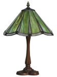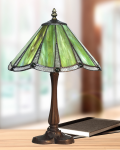 Our beautiful Gianni Tiffany Table Lamp adds a bold touch of soothing color to your home or office. The generously sized conical shade features large wedges of iridescent art glass in blue, green and gray. Shimmery Gray insets around the shade, along with a matching bottom border with art glass gems provide an excellent contrast. The metal base is and round pedestal are beautifully cast and finished in Antique Bronze. A lovely choice in living rooms, bedrooms or offices, our Gianni Tiffany Table Lamp also makes a pretty desk lamp on larger workstations.