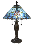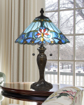 Our magnificent Orilla Jewel Tiffany Table Lamp is destined to become the focal point in any room in which it is displayed. The beautiful fixture features a cone shade that is crafted of glass wedges in a blue background that is lighter at the top and darker closer to the top. Around the bottom half of the shade, a wandering vine in shades of iridescent blue, amber and white flows from top to bottom, wrapping itself around an abstract red and white blossom. We added art glass gems and jewels throughout for added sparkle and color. The metal base features a finely cast design allover and is finished in deep Fieldstone. A show stopper in any décor, our Orilla Jewel Tiffany Table Lamp is especially lovely when displayed on matching end tables or nightstands.