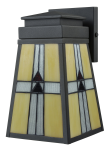 Our lovely Barkley Outdoor Wall Sconce features Mission design influences that will easily accentuate any exterior design in your home. The sconce features an elongated shade that is gently flared at the bottom. Each side features 4 large panels of sunny amber at its corners. These are bisected by a cross design of clear frosted glass that is outlined in dynamic black filigree. A pair of arrowhead shaped glass jewels at the center of each panel adds an extra Mission era touch and a bold splash of color when Barkley is illuminated. Barkley hangs from a square metal backing plate and wall arm, both finished in rich black to match the filigree. Our Barkley Outdoor Wall Sconce is a fantastic addition to a porch or patio area that will make bold design statement for years to come.