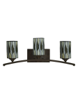 Our Reno 3 LT Tiffany Wall Sconce adds contemporary elegance with a retro twist to any décor style. The sconce features a rectangular metal backing plate and wall arm that are finished in Antique Golden Bronze. A trio of matching uplit conical shades are mounted on a gently arched crossbar. Each shade features a background of alternating waves of white and light amber. Dark amber insets around the circumference add extra color and contrast. Our Reno 3 LT Tiffany Wall Sconce is a perfect solution for lighting smaller spaces. Try hanging in multiples around the perimeter of a larger rooms for a whole room light your family will enjoy for years to come.