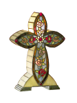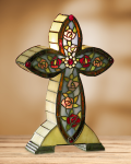Red and pink roses are featured on the Flaura Accent Cross accent lamp. Art glass edges trim the cream body panels and will glow brilliantly when the lamp is lit. The accent lamp is beautifully embellished with red jewels for added color. This accent lamp a perfect choice for end tables, nightstands, dressers or anywhere that requires that little something special.
