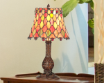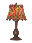 Designed for small, out of the way areas, the Manti accent lamp’s vibrant colors of orange, red, green and amber will easily become the centerpiece of any room you choose to display it. 135 pieces of art glass and art glass jewels shine brightly. Red art glass jewels are set around the shade’s top and at the point of each scallop along the bottom of the shade to add an extra twinkle that will radiate throughout the room. The textured detail on the metal base, finished in antique brass is designed to reflect the shade’s glow for a truly spectacular effect.