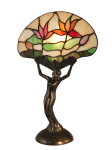 Our pleasant Water Lily Accent Lamp will take you on a delightful journey to a bygone era. The metal base is cast in the image of a graceful woman dressed in a slinky art deco gown. Bent at the knees, she leans ever so slightly backward. In her extend arms; she holds a delicate fan shade. The shade’s background is buttery amber and is adorned with vibrant orange and yellow lilies, nestled amidst lush greenery. The shade is crafted of art glass that is hand rolled and individually copper foiled, using the same technique first developed by Louis Comfort Tiffany in the Nineteenth Century. The shade is backlit by a 60W bulb (not included) and will glow warmly when the lamp is lit, adding a gentle pop of color when nestled on a shelf, curio cabinet or occasional table.
