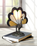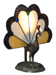 Our pleasant Alexander Tiffany Accent Lamp encompasses the beauty of the peacock and its beautiful feathers. The solid BRONZE base is cast in the image of a peacock with a delicate fan shade as its feathers. The shade is made of hand rolled art glass using the copper foil technique and has vibrant green and blue jewels. The shade is backlit by a 60W candelabra bulb (not included) and will glow warmly when the lamp is lit, adding a gentle pop of color when nestled on a shelf, curio cabinet or occasional table.