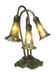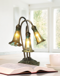 This lovely 3 LT Gold Lily Accent Lamp adds a touch of classic elegance to any room in your home. The fixture features a trio of elongated lily shades that are hand blown using Favrile art glass in burnished golden amber and green that will emit a cozy glow when the lamp is lit. The Favrile process embeds the color within the glass itself, which allows for subtle variations in tone and texture. This means that no 2 pieces are exactly alike. The shades are mounted at the ends of a trio of gracefully curved “stems” that rise upward from the lily pad base. The base and stems are crafted of cast bronze and finished in Antique Bronze Verde. Sure to add a subtle touch of the great outdoors, our 3 LT Gold Lily Accent Lamp also makes a one of a kind desk lamp on larger desks and workstations.