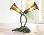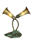 This lovely 2 LT Gold Lily Accent Lamp adds a touch of classic elegance to any room in your home. The fixture features a pair of elongated lily shades that are pointed outward to direct the lamplight out into the room. Each shade is hand blown using Favrile art glass in burnished golden amber and green that will emit a cozy glow when the lamp is lit. The Favrile process embeds the color within the glass itself, which allows for subtle variations in tone and texture. This means that no 2 pieces are exactly alike. The shades are mounted at the ends of gracefully curved “stems” that rise upward from the lily pad base. The base and stems are crafted of solid cast bronze and finished in Antique Bronze Verde. Sure to add a subtle touch of the great outdoors, our 2 LT Gold Lily Accent Lamp is crafted to last to provide your family with a lifetime and beyond of elegantly reliable lighting.