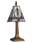 Soothing pastels combined with an arts and crafts inspired design make our Tavas Tiffany Accent Lamp an ideal addition to any room’s décor. The triangular shade features 4 side panels with backgrounds of iridescent art glass. A large circular inset at the center of each side touts a featherlike pattern in amber and white that is set against a sky blue background. A pretty border in iridescent lavender adds even more color when the lamp is lit, while bold filigree throughout adds definition and texture. The metal base is finished in Antique Brass and features a squared center column that is beautifully appointed with cast design elements. A beautiful choice in living rooms, bedrooms or dens, our Tavas Tiffany Accent Lamp will provide you with years of both reliable and artistic lighting.