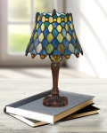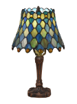 Our lovely Maile Tiffany Accent Lamp is an easy way to add a splash of soothing color to any room in your The lamp features a flared shade crafted of art glass pieces in woven pattern of iridescent green, deep blue, and amber that will cast a glow of vibrant color when the lamp is illuminated. We added a row of amber art glass gems around the shade’s bottom for extra sparkle and texture. The metal base is finished in Antique Bronze and features a finely cast tapered center column with a rounded pedestal base. Ideal tucked away on a bookcase, occasional table or curio shelf, our Maile Tiffany Accent Lamp also makes a wonderful gift for any occasion.