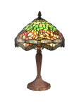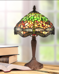 Our pretty Zalena Dragonfly Tiffany Table Lamp adds bold color and warmth to your home or office. The lamp features a deep cone shade that begins with a dual border of iridescent green and amber at its top that gives way to a layer of leafy green. Next, a layer of art glass pebble stones in blazing red, yellow and orange are the ideal backdrop for a row of Tiffany’s signature dragonflies stand wing to wing with yellow bodies, red glass gem eyes and delicate filigree wings that form the bottom border of the shade. The base, finished in Antique Bronze, is lovingly cast with reeding on the center column and dragonflies on the fluted pedestal. A colorful show stopper in any décor, our Zalena Dragonfly Tiffany Table Lamp will provide you with years of colorful and reliable lighting,