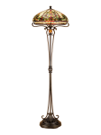 Inspired by French Art Nouveau artist Emile Galle, this divine floor lamp, from our Boehme family will add a touch of 19th century French artistry to your home. The shade is double overlaid and etched in earthy green, yellow, orange, pink and beige tones set in a classic French fleur de lis pattern with a textured amber border and art glass jewel accents throughout. The shade sits atop a harp style wrought iron mount that is accented with a large amber art glass orb. Destined to be the focal point of any room, this floor lamp is as beautiful as it is functional.
