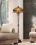 Our Briar Dragonfly series create a marriage of Renaissance era inspired wrought iron and Tiffany’s iconic dragonfly for a match made in Heaven. The dome shaped shades all feature a background of sunny amber art glass, each with band of iridescent dragonflies running around the shade’s circumference. Art glass jewels in saturated jewel tones are interspersed throughout for added color and texture. Each shade is finished with bead detailing around the edge for added authenticity. This splendid floor lamp features a generously sized shade sitting atop a harp style base crafted of solid wrought iron. The harp meets at the top of the column and surrounds an amber glass orb. Side arms flow inward to the center of the column then flare back out to scrolled ends at the pedestal base. Our Briar Dragonfly floor lamp stately beauty will quickly become the centerpiece of any room in your lovely home.