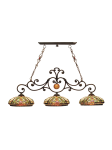 Our Boehme 3 light hanging fixture features Renaissance era styling designed to accent today’s home style trends. 3 matching art glass shades have a background of crisp white art glass with an intricate fleur de lis pattern in yellow, amber and green wrapped around the entire shade. Jewel tone art glass jewels are interspersed throughout the design for added texture and sparkle. The shade’s bottoms are banded with a pair of dark amber borders and a row of metal beads. The shades hang from an intricately scrolled metal frame with an amber art glass orb at its center. T he frame is suspended from a metal ceiling canopy, dual wire cables and decorative chain. An ideal choice over a kitchen island, breakfast bar or larger eating area, our Boehme 3 light hanging fixture provides functional lighting in an artistic package.