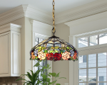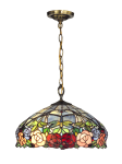 Louis Comfort Tiffany’s well-known love of nature is again recreated in our Zenia Rose hanging pendant. A bevy of abundant roses in shades of red, lavender, pink and yellow, nestled amidst lush greenery runs along the bottom edge of the shade. Just above, Tiffany’s trademark dragonflies cavort about against a blue-green sky. Vivid blue and crimson art glass jewels are interspersed throughout the design, which adds an extra dimension of color and texture. The shade hangs from a metal vase cap, chain and ceiling canopy, all finished in antique bronze. A lovely choice over a kitchen or informal dining area, Zenia Rose will add charm and grace wherever it is hung.