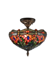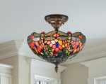 Tiffany’s iconic dragonflies plus glass jewels in a kaleidoscope of colors equal blazing beauty in or Sonota semi flush mount fixture. 420 pieces of art glass form a burning background of red, orange and yellow. Green, blue, red, orange, and amber art glass jewels add extra sparkle. The top edge of the inverted bowl shade is made up of fiery dragonflies with light orange bodies and red jewel eyes standing end to end. Each dragonfly’s wings are depicted with the meticulous filigree detail you expect from our artisans. The shade hangs from an intricately cast metal canopy finished in dark antique bronze. A bright choice over a smaller eating area, Sonota also brings a splash of color to any room when used as a ceiling fixture.