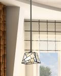 Our Contempo Collection Mini pendants deliver an abundance of design impact in a compact size that will accentuate any decor style. Abella’s rectangular shade features an array of geometric panels in light amber and creamy natural, which have been set in an angular pattern. Abella hangs from a metal ceiling canopy and rod, which enhances the sleek modern lines of the fixture. Abella’s 60 W bulb makes it a unique spotlight over a special objet d’ art and also provides ample light when hung in multiples over a breakfast bar or kitchen island.