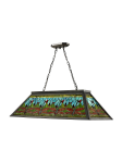 A background of cool green and blue provides the perfect setting for deep red dragonflies in our Glade pool table fixture.508 pieces of art glass in total, each piece is individually hand rolled and copper foiled using the same technique first developed by Louis Comfort Tiffany more than 120 years ago. The dragonflies flit over a green field, set under a bright blue sky. Complementary blue and red art glass jewels throughout the design provide extra color and texture. The oblong shade hangs from a bold metal frame with matching chain and ceiling canopy, all finished in Tiffany bronze. An ideal choice over a billiard or pool table, Glade also makes a distinctive fixture over a larger dining table and will quickly become one of your family’s most cherished heirlooms.
