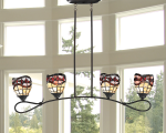 Our Fall River series brings a look reminiscent of Colonial America into your Twenty First century home or office. This graceful pendant features 4 uplit shades on a graciously curved metal rod that hangs from a simple ceiling canopy and double support rods. Each shade features a sunny light amber background. A band of art glass jewels in rich earth tones sits on a grey background, which is bordered by a deep amber ribbon that meanders around the shades circumference and free-form edge. An ideal choice over a larger dining table or kitchen island, this lavish pedant is sure to win you rave reviews from your family and friends.