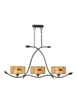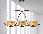 East meets West in our dynamic Fall Leaf series with its Eastern inspired glasswork mounted on contemporary Western metalwork. This exotic 3 light hanging fixture is suspended from dual wire cables with decorative chain, which hang from a cast metal ceiling canopy. Gracefully elongated scrolls are crossed and joined with a curved metal horizontal bar, complete with “barbed wire” ties and cast leaf finials. Each of the 3 uplit round shades are graced with anthurium blossoms on a buttery light amber background designed to create a rich, warm glow when the fixture is lit. Perfect over a kitchen island or bar, this also makes a unique billiard or dining table fixture that will add an instant decorator’s touch to any room in your home.