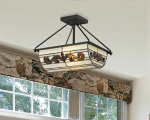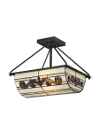 Today’s contemporary style blends with the craftsmanship of Louis Comfort Tiffany in the DT Contempo Collection. The one of a kind style of our Cupertino semi-flush mount will bring a unique charm and grace to your home. The inverted oblong pendant features a background of rectangular panels in creamy natural and light amber art glass. A fluid scroll design in rich, dark amber graces each side of the shade. Amber art glass jewels have been placed throughout the design for added texture. Cupertino gracefully hangs from a ceiling canopy, center support rod and 4 corner support rods, all crafted of metal. A perfect choice over a relaxed dining area or kitchen island, Cupertino easygoing elegance will reflect your good taste for years to come.