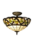 Our magnificent Reveli Semi-Flush Mount Fixture will add a vintage touch of Renaissance beauty to your home or office. The large inverted bowl shade begins with a background of sunny amber art glass that is set in a grid pattern at the bottom of the shade that radiates upward to a large wandering vine border at the top. The brown vine is accented with light green leaves and is dotted with art glass gems in bright amber throughout for added texture and sparkle. Reveli hangs from a luxurious metal ceiling canopy that is cast in an intricate pattern. A matching finial provides just the right finishing touch. A fantastic choice over larger dining areas, our Reveli Semi-Flush Mount Fixture is also ideal in a foyer or as a ceiling fixture in larger rooms.