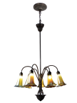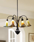 This pretty 7 LT Gold Lily Hanging Fixture is an elegant addition to any decor. The amazing fixture features 7 elongated lily shades. Each shade is hand blown using Favrile art glass in burnished golden amber and green that will emit a cozy glow when the lamp is lit. The Favrile process embeds the color within the glass itself, which allows for subtle variations in tone and texture. This means that no 2 pieces are exactly alike. Each shade is suspended from the end of 7 curved arms that wrap around the center column, just above the sleek fount. The cast bronze fixture hangs from a ceiling canopy, wire cable/chain that extends down to an upper fount and sleek center support tube, all finished in Antique Bronze Verde. The ideal way to light a formal dining area, our 12 LT Gold Lily Hanging Fixture also makes a wonderful whole room or foyer fixture in rooms and foyers with higher ceilings.