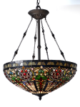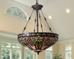 A magnificent mélange of color and texture, our Fire Opal Inverted Tiffany Pendant is sure to become the focal point in any room in which it is displayed. The generously sized inverted bowl shade features a wide horizontal band of florals, loops and swirls in blues, greens near the top edge. Vertical bands of deep amber on a lighter grid background are alternated with the same florals that extend to the shade’s bottom. The addition of a wide top border of iridescent green and blue, along with amber art glass gems throughout add even more color and sparkle when the pendant is illuminated. Fire Opal hangs elegantly from a round ceiling canopy, and chain/wire cable that extend to a fount from which the center support tube and 4 side support chains extend. All finished in lovely Tiffany Bronze, each chain features amber glass beading for even more sparkle. A stunning fixture over a large dining area, our Fire Opal Inverted Tiffany Pendant also makes a spectacular way to greet guests when hung in foyers or entryways with high ceilings.