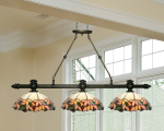 Pretty and functional, our Crystal Leaf Tiffany Island Fixture beautifully recreates Tiffany’s well-known love of nature. A trio of dome shades hang from a cross bar. Each shade begins with a background of crisp white near its top with a large border of leaves in pink, mauve, blue, green and amber around the bottom. Amber glass gems are tucked away throughout to add sparkle and texture when the fixture is illuminated. Crystal Leaf hangs from a round ceiling canopy, finished in Antique Bronze with matching finial, dual support chains that extend down to a matching round fount from which 2 side chains supports the matching horizontal bar. A lovely fixture over a kitchen island, breakfast nook or gaming table, our Crystal Leaf Tiffany Island Fixture works well with any décor style to ensure it will provide you with years of beautifully reliable lighting.