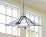 Contemporary with a twist, our Mack Rose 5-Light Tiffany Hanging Fixture easily assimilates into any home’s décor. The generously sized shade is crafted of geometrically shaped fused glass panels that are separated by shimmery filigree on each side. A pair of stylized rose blossoms in delicate pink and green extend downward from the shade’s top on each side to provide a gentle pop of color when the fixture is lit. The metal base, finished in Brushed Nickel, features 4 arms extending outward from the rectangular center to direct the lamplight outward and downward simultaneously. Mack Rose hangs gracefully from a round metal ceiling canopy and wire cable/chain that are also finished in Brushed Nickel. A great way to illuminate a contemporary dining area or breakfast nook, our Mack Rose 5-Light Tiffany Hanging Fixture will provide your family with many years of functional and artistic lighting.