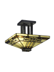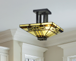 Our artisans are proud to present the popular Mission style shade for your ceiling. The San Carlos fixture features all of the elements of a mission style lamp in a ceiling fixture. A square shade with geometric patterns including arrowheads, triangles, horizontal and vertical bands in earthy shades of green, amber and red will complement any decor style from antique to contemporary. The metal base is a classic 4 post mission style and is finished in authentic antique bronze. Perfect for a den, office, hall or entryway, San Carlos will become a part of your family for many generations.