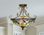 Peony blossoms in pastel shades of pink, blue and purple grace the generous inverted bowl shade on this attractive ceiling fixture. Each bloom features a red art glass center and is wrapped in lush green foliage. Shimmery green-gold art glass jewels are placed at intervals around the shade’s circumference. The bowl is suspended from a cast metal plate, which holds 3 flowing branches, all finished in antique golden sand. Each branch is adorned with amber crystal leaves, designed to reflect the light beautifully when the fixture is lit. An ideal choice for an entryway, this also makes a pretty ceiling fixture for a family room or bedroom which will complement any decor style in your home.