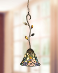 160 pieces of art glass in beautiful shades of springtime are hand set using the same technique first employed by Tiffany over 120 years ago. Iridescent art glass crystals and red art glass have been placed at intervals around the shade for added sparkle and texture. The metalwork is finished in antique golden sand for a burnished, antique feel and is accented with metal and crystal leaves for a truly unique look in a pendent fixture. A perfect choice for a kitchen or casual dining room, this pendent will bring an instant designer look to any room in your home.