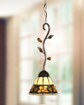 Natural beauty takes center stage in this pendent lamp. Lovely, polished pebble stones in warm earth tones around the bottom of the shade. Shell-shaped art glass crystals are set at intervals within the stones for a rich glow. Bands of creamy beige art glass on the shade’s top provides an overall balance of design. The shade hangs from a scrolled metal branch, which is finished in antique golden sand and is adorned with metal and amber crystal leaves to maximize sparkle. An excellent choice over a billiards table or over your casually elegant dining table, anywhere you chose to display it, this pendant will bring a rich warm glow to your home.