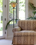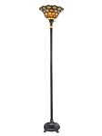 This peacock torchiere will be a magnificent addition to any room in your home or office. Overlapping rows of buttery light amber art glass feathers on the up shade are outlined in draped ribbon of deep amber. Red and amber art glass jewels have been added throughout the design for added texture and color. The sleek base, finished in a deep fieldstone finish, features a marbleized accent and finely cast footed base. Both functional lighting and colorful work of art, this torchiere is destined to be the focal point in any room in which it is displayed.