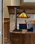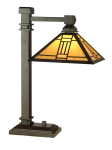 Perfect for a den, study or office, the bold, rugged style of this bridge style table lamp will quickly become one of your favorites. The square mission shade is shimmering amber and is overlaid with a traditional mission style vertical design. The strong, military style base is finished in a dark mica bronze, which will work well in any decor style.
