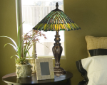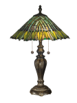 Verdant tropical vines appear to be woven together and growing downward from the shade’s top in the Leavesly table lamp. Green, brown, yellow and tan vines are set against a background of vibrantly rich blues and purples, bringing to mind the colors of a tropical rainforest. A green art glass jewel has been set between each leaf’s top and bottom that will glow with luminous color when the lamp is lit creating a true work of art that will accent any room of your home. A gracious base featuring leaf detailing is finished in a Fieldstone finish for a natural look.