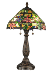 The innovative design and painstaking attention to detail you have come to expect from Dale Tiffany once again shines through in the Trellis table lamp. The gently domed shade features a floral vine with pastel pink, lavender and blue blossoms winding its way through a brown trellis. Set against a background of lush green leaves and sunny yellow art glass, our artisans have added art glass jewels in red, blue, yellow, white and green for depth and texture. The shade’s bottom edge is cut out along the borders of the leaves and petals for realistic detail. The metal base is reeded and features a fleur de lis pattern both on the column and just under the shade. The base and matching finial are both finished in fieldstone for an added natural feel. A perfect accompaniment to any decor style, the Trellis lamp is a wonderful way to bring a taste of the great outdoors into your home or office.