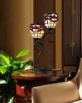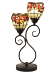 Our Fall River series brings a look reminiscent of Colonial America into your Twenty First century home or office. This delightful 2 light table lamp adds a unique look to any room with its 2 uplit shades that sit on a gracefully curved metal rod and pedestal. Each shade features a sunny light amber background. A band of art glass jewels in rich earth tones sits on a grey background, which is bordered by a deep amber ribbon that meanders around the shades circumference and free-form edge. A lovely choice on end tables or larger nightstands, this fixture also makes a one of a kind desk lamp that you will be proud to display in any room.