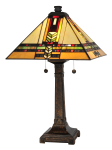 A kaleidoscope of mission-inspired color makes our Palo Mission table lamp a welcome addition to your home or office. The square shade features a base color of light and medium amber art glass panels. A vertical band of arrowheads in green and amber is surrounded by deep red, blue, orange and yellow squares and rectangles. A horizontal row of green and amber swirled glass is bordered top and bottom by rectangular panels in complementary colors. A squared metal base is cast with geometric detailing to complete the authentic mission feel. A bright splash of warm color in any room, our Palo Mission table lamp is one you will be proud to display for many years to come.