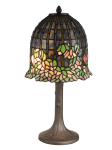 Our Flowering Lotus Table Lamp adds a pretty finishing touch to any decor. The deep dome shade features a background of iridescent blue, green and amber, which gives the shade its mysterious feel. Swirls of lotus blossoms in yellow, pink and blue are suspended from delicate green hanging vines. The lotus flowers extend to the contoured edge of the shade for added realism. The addition of a metal tree trunk base adds to the mystical woodsy flavor and ties the entire design together perfectly. A lovely addition to a powder room, bedroom or office, our Flowering Lotus Table Lamp will provide you with many years of magical and trustworthy lighting.