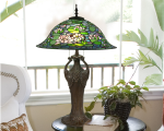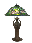The lush florals and saturated colors of our Ren Tiffany Table Lamp make it a beautiful accompaniment to any décor. The flared dome shade features an allover pattern of pink and white blooms that are nestled amidst a background of leafy green leaves and sky blue panels. Each piece of glass is hand rolled and individually copper foiled using the same technique first developed by L.C. Tiffany in the late 19th Century. The solid bronze base is finely cast with an intricate design featuring split harp detailing and is finished in authentic Antique Bronze. No matter where you choose to display it, our Ren Tiffany Table Lamp is beautifully appointed, guaranteeing you many years of museum worthy lighting.