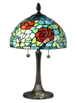This pretty Crimson Rosette Table Lamp is a lovely addition to any room in your home or office. Bright red rose blossoms in an alternating high low pattern are set against a bright blue background of slate shaped art glass panels. Touches of green leaves, blue-green vines and white accents add to the natural feel of the lamp. An iridescent blue border at the shade’s top and bottom perfectly highlights the floral design. The solid brass base is finished in Antique Bronze Verde and features a finely cast floral motif around the flared pedestal. A matching flame finial completes the look and adds balance to the overall design. A lovely choice on matching end tables or nightstands, our Crimson Rosette Table Lamp will provide you with years of artistically reliable lighting.