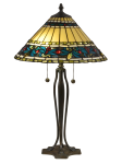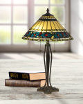 Our Jeweled Leaves Table Lamp is a delightful combination of timeless craftsmanship and contemporary styling that will seamlessly adapt to your home’s evolving décor. The cone shade begins with sunny amber art glass wedges around its middle. A wide band of lush florals in vibrant red, green and yellow, accented with red glass gems adds a pop of vivid color. Smaller bands of glass in complementary colors add even more sparkle and shine. The solid brass base is finished in Antique Bronze Verde and features a split harp center column with flared feet atop a cut out pedestal. A wonderful choice in any room in your home or office, our Jeweled Leaves Table Lamp will provide you with many years of elegantly reliable lighting.