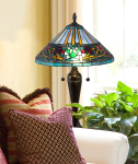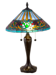 Our dynamic Amada Tiffany Table Lamp will make a bold design statement in any room. The conical shade features a background of alternating azure blue and amber wedge shaped panels near the top. A wide horizontal band just below features a wandering vine in matching amber that is dotted with clusters of art glass ‘berries”. Large insets at intervals around the shade’s circumference feature serene lotus blossoms in green and white with a bottom border of iridescent green-blue. The tapered metal base is beautifully textured and finished in rich Fieldstone. A matching flame finial and vase cap tops the fixture and adds balance to the overall design. Our Amada Tiffany Table Lamp will add a vivid pop of saturated color to bedrooms, dens or offices.