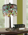 Our pretty Rowan Floral Tiffany Table Lamp is a floral fantasy that will bring a colorful touch of the great outdoors into your home or office. The large dome shade features an allover design depicting a flowering tree. Multitudes of spring blossoms in delate pastel colors will add a beautiful, colorful glow to your room when Rowan is lit. The brass tree trunk style base is finished in Antique Bronze/Verde which perfectly accents the colors in the shade. Sure to be any room’s focal point, our Rowan Floral Tiffany Table Lamp is destined to become a cherished family heirloom to be passed from one generation to the next.