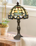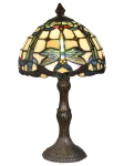 Our delightful Javie Dragonfly Tiffany Accent Lamp features all the big design elements of Tiffany’s larger designs in a size that will easily assimilate into any décor. The lamp features a delicate dome shade with a background of sunny light amber art glass pieces that are set in a grid pattern with art glass jewels set at the corners. Large dragonflies with iridescent bodies and glass gem ‘eyes’ are placed at intervals around the shade and are surrounded by vertical columns of amber glass that blend into a colorful blue and red woven border at the top and bottom of the shade. The metal base is finished in Antique Brass and features fine detailing throughout the center column and round pedestal. An ideal way to begin or add to an existing Tiffany Collection, our Javie Dragonfly Tiffany Accent Lamp Lamp is destined to become a cherished family heirloom to be passed from one generation to the next.