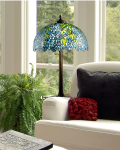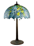 Louis Comfort Tiffany was well known for his love of nature. Our designers have beautifully recreated that love in this Porto Wisteria Tiffany table lamp. A multitude of individual glass pieces, each hand rolled and copper foiled come together in a free form depiction of a graceful willow tree. Blossoms in shades of blue and yellow are nestled amidst lush green leaves and brown branches flow downward to the shade’s free form edge. A finely cast metal base completes the realistic feel of the lamp. A perfect piece for end tables and nightstands, our Porto wisteria table lamp is a must have piece for any Tiffany enthusiast that will provide you with a lifetime of beautiful, reliable service.