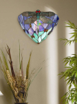 Brilliantly resplendent, the vivid jewel tones in this sconce will add rich color when the fixture is illuminated. Large dragonflies in green and blue, complete with crimson art glass eyes are set against a slate pattern in vibrant shades of blue, purple, and green. The filigree overlay in the dragonflies wings is rendered in great detail and when set against the multicolored background, gives a lovely mottled affect. Extra glass jewels in complementary shades add even more color and texture. Instant color and drama, this shade will be both a functional light fixture and beautiful illuminated artwork for your home for years to come.