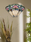 The understated elegance of our Windham wall sconce will add a touch of grace to any room in your home or office. The gently scalloped uplit shade features a base of creamy natural art glass panels. An alternating band of pastel pink and blue flowers and shells runs around the top edge of the shade. Vertical panels of the same pink and blue are placed at intervals throughout the shade. A band of blue-green, with fan insets at the point of each scallop runs along the top edge. Jewels in complementary colors are scattered throughout, adding extra sparkle and texture. The shade hangs from a white metal base. A lovely choice hung alone in an entryway or in multiples in a hallway, Windham’s ethereal beauty is the perfect finishing touch to any decor style.
