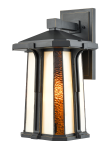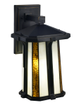 Bright white and amber glass makes our Fleetwood Outdoor Tiffany a warm addition to your home’s exterior. The rectangular glass shade is gently flared at the bottom and features vertical panels of alternating opaque white and translucent amber will cast a warm glow outside your home. The shade is encased in an open pagoda style metal frame that is finished in deep Golden Black. The sconce hangs from a rectangular metal backing plate and wall arm that are finished to match in Golden Black. A wonderful addition to a porch or entryway, our Fleetwood Outdoor Tiffany Wall Sconce will proudly show you the way home for many years to come.
